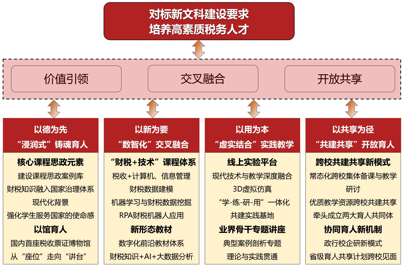 税收学专业作为学校传统优势专业,扎根红土地办学,坚持以新文科建设为引领,以培养适应时代要求的高素质税务人才为改革目标,系统构建“价值引领、交叉融合、开放共享”三位一体的税务人才培养新体系。