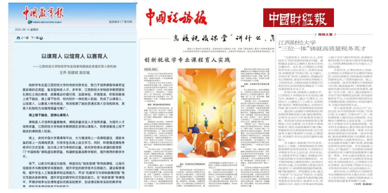 关注度高。近年来,教育部主管的《中国教育报》、国家税务总局主管的《中国税务报》、财政部主管的《中国财经报》分别以《对标新文科打造新优势》《以课育人、以馆育人、以赛育人》《打造税收学专业金课群》《创新税收学专业课程育人实践》《江西财经大学“三位一体”铸就高质量税务英才》等为题,专栏报道并高度评价了学校税收学专业的教学改革模式及育人成效,产生了较大社会影响。