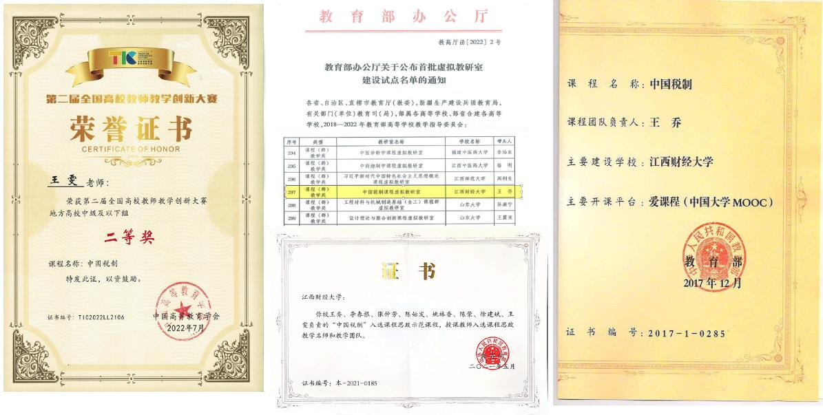 教研团队主持建设了首批国家精品在线开放课程、国家课程虚拟教研室、全国社科普及基地等10余项国家级课程与教研平台,“中国税制”课程2026年被遴选为面向全国高校推广的总书记分领域思想专题优质课程;主编的《中国税制》教材荣获第二届全国教材建设奖、“十四五”国家级规划教材;教学团队荣获教育部首批课程思政教学名师和教学团队、第二届全国高校教师教学创新大赛二等奖、江西省高水平本科教学团队等荣誉称号10余项;主持教育部首批新文科研究与改革实践项目等国家与省部级教改课题20余项;在《新文科教育研究》《中国大学教学》等核心期刊发表教改论文10余篇。研究成果获教育部第八届高等学校科学研究优秀成果奖、中国税务学会学术研究优秀成果特等奖等10余项高等次奖项。